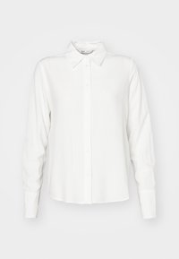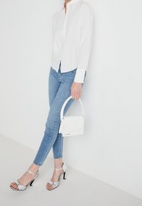 Personne portant une chemise blanche à manches longues boutonnée, associée à un jean en denim bleu clair, devant un fond uni.