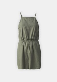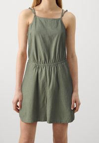 Femme portant une robe sans manches olive à taille froncée et à double bretelles, debout devant un fond uni.