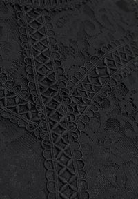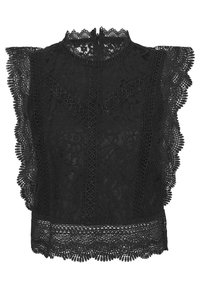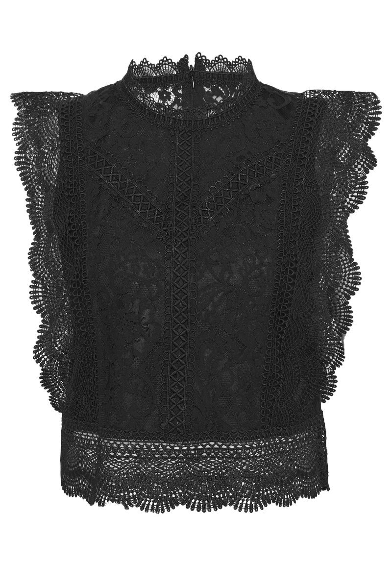 Haut en dentelle noire avec des motifs floraux intricats, des manches à volants et un col haut avec une fermeture éclair au dos.