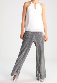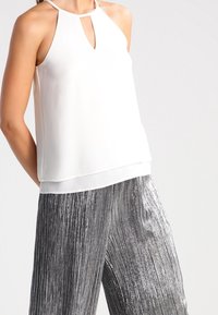 Haut blanc sans manches avec un détail en forme de trou à la poitrine, associé à un pantalon large plissé argenté, présentant une texture lisse et brillante.