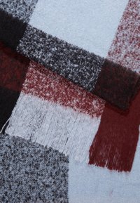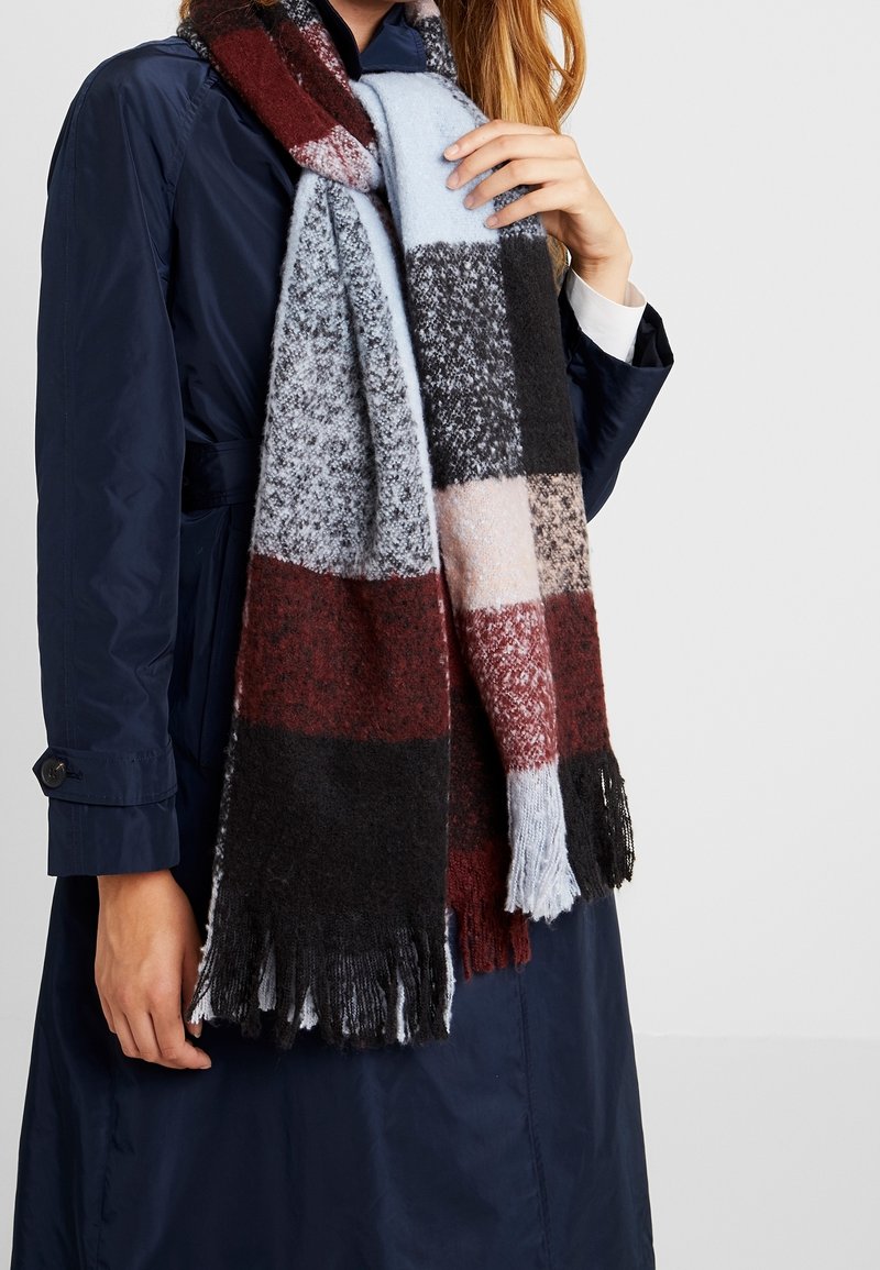 Personne portant un manteau bleu marine et une écharpe à carreaux multicolores avec des blocs noirs, bordeaux, gris et bleu clair, à extrémités frangées.