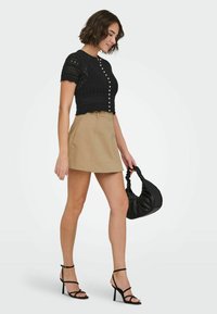 Femme souriante, portant un haut noir à manches courtes en dentelle avec boutons et une mini-jupe beige, tenant un sac à main noir froncé.