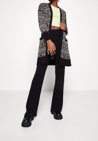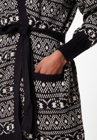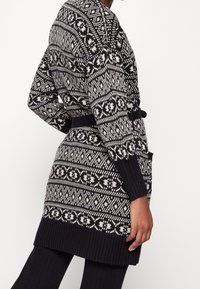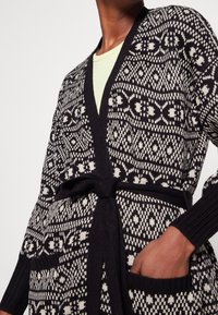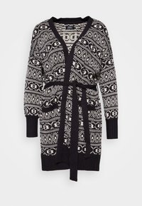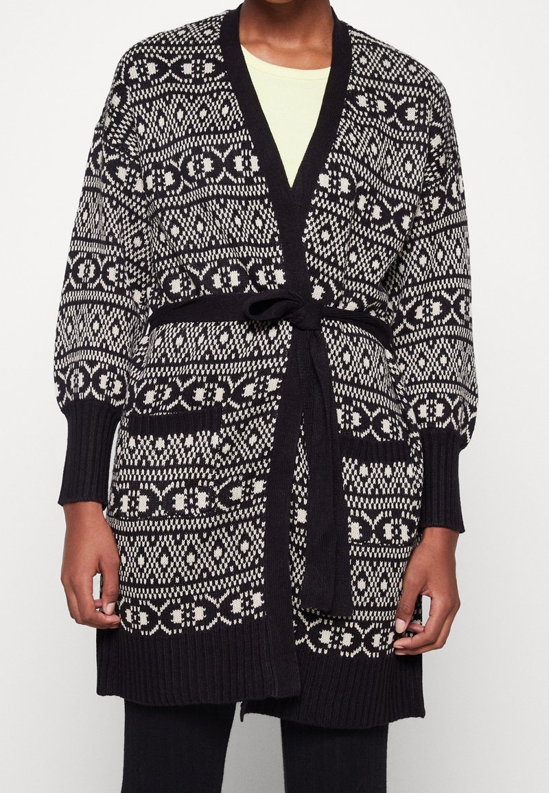 Cardigan en tricot noir et crème, avec un motif géométrique, manches longues, col en V et taille ceinturée. Finition texturée avec poches.