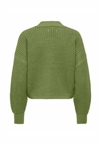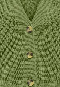 Cardigan vert court en maille avec col en V, trois boutons en écaille de tortue, manches longues bouffantes et poignets et ourlet côtelés.