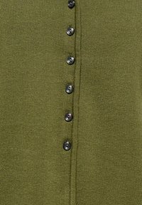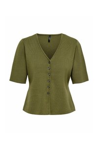 Cardigan en maille vert olive à manches courtes avec col en V et six boutons à l'avant, coupe ajustée, tissu doux et texturé.
