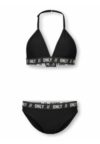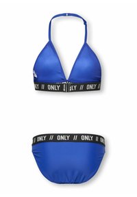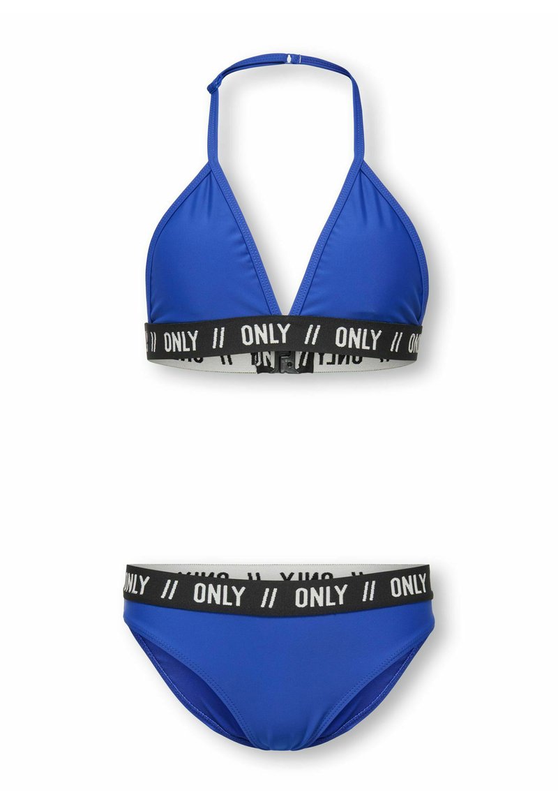 Ensemble bikini bleu avec bandes élastiques noires ornées du texte blanc « ONLY », haut triangle à col halter et bas assorti taille basse.