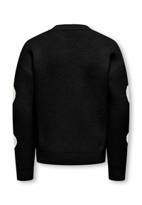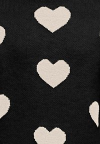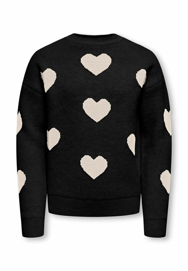 Pull noir en tricot avec plusieurs grands motifs de cœurs blancs répartis uniformément sur le dos et les manches.
