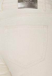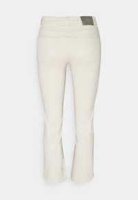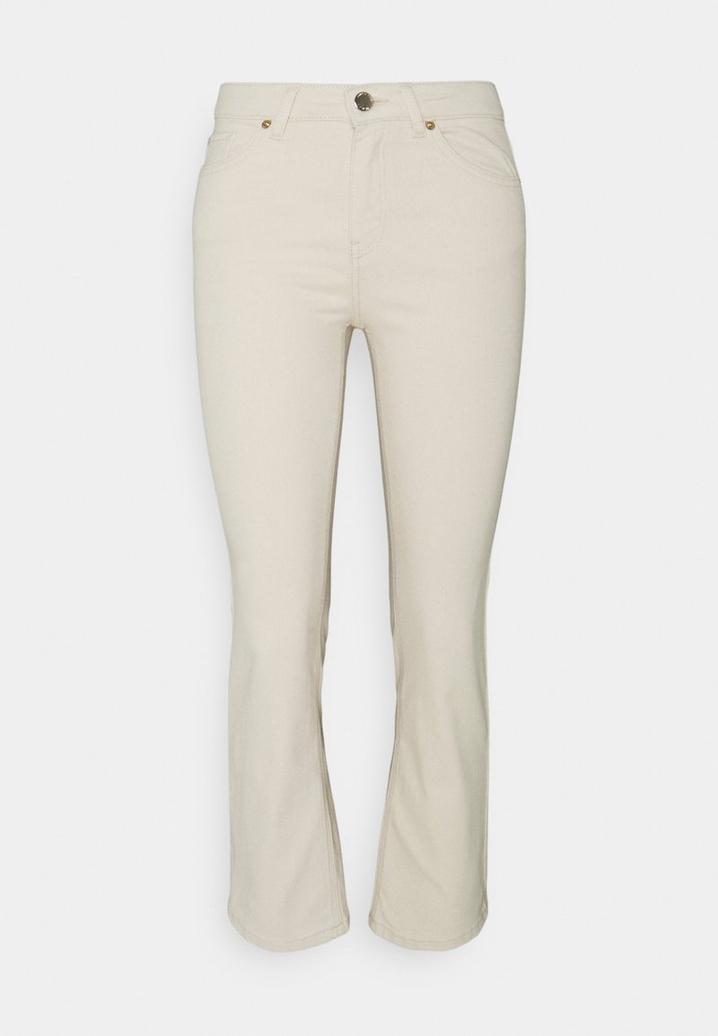 Jean évasé beige en mélange de coton léger, avec fermeture à boutons sur le devant, passants pour ceinture et détails de coutures discrètes sur les poches.
