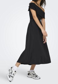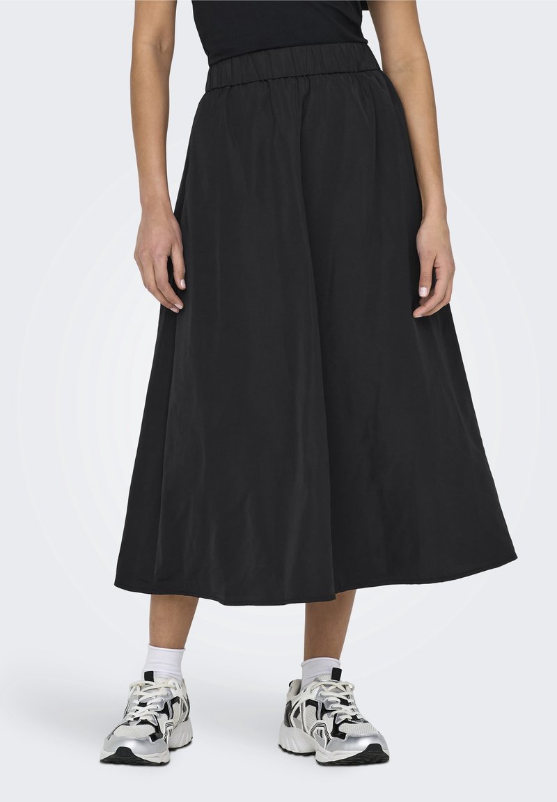 Jupe noire longueur cheville avec taille froncée, confectionnée en tissu léger ; associée à des baskets blanches et argentées de sport.