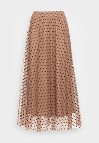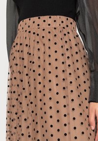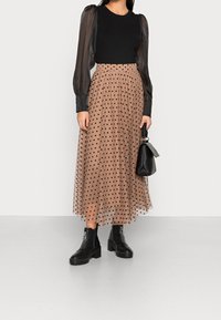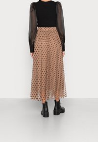 Jupe midi en tulle beige à pois noirs, portée avec un haut transparent à manches longues noir et des bottines noires à fermeture éclair.