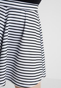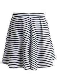 Shorts blancs à rayures horizontales bleu marine, design plissé, taille élastique, associés à des sandales à talons hauts noires. Texture de tissu lisse.
