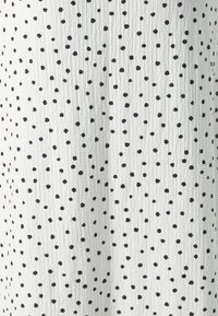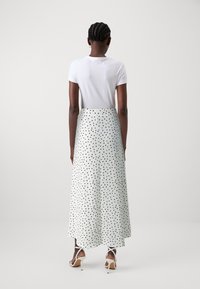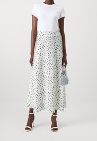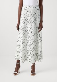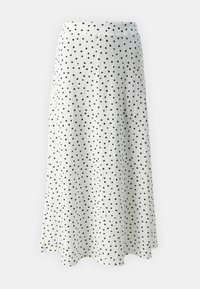 Jupe longue en tissu léger et texturé blanc à pois noirs. Elle présente une taille haute et une silhouette fluide.