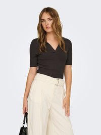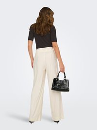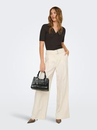 Femme aux cheveux ondulés portant un haut noir à manches courtes et col en V, ainsi qu'un pantalon large crème taille haute, tenant un sac à main noir à côté d'elle.