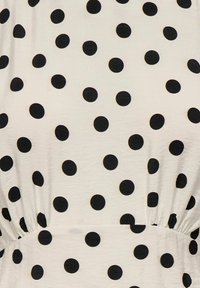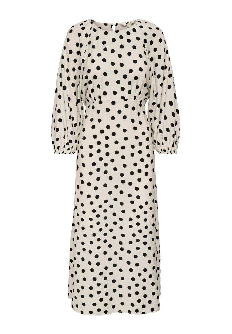 Robe midi blanche à pois noirs, manches longues bouffantes, taille cintrée et encolure ronde.