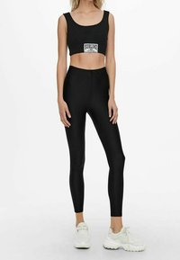 Leggings noirs en tissu lisse et extensible, dotés d'une taille haute et d'une silhouette ajustée. Associés à des baskets blanches.