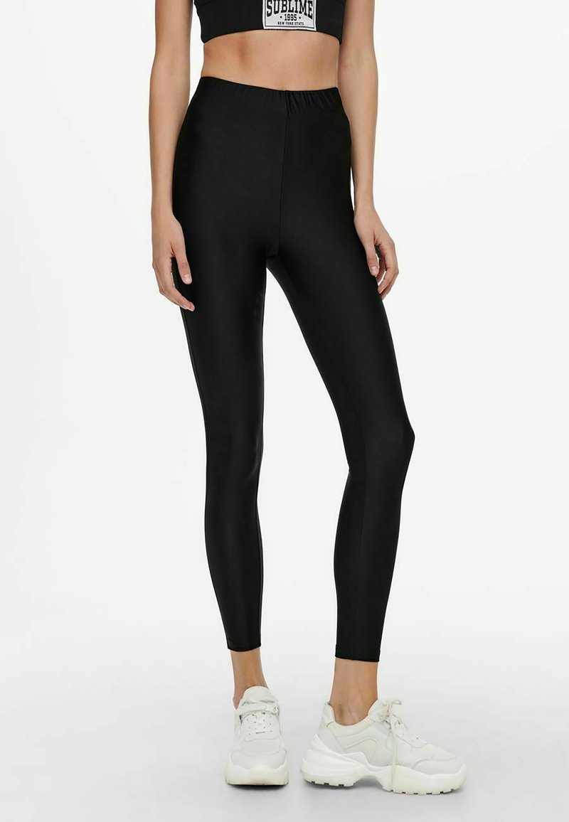 Leggings noirs taille haute en matériau lisse et extensible, présentant une coupe ajustée et des détails de couture minimaux, associés à des baskets blanches.