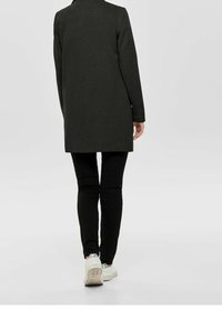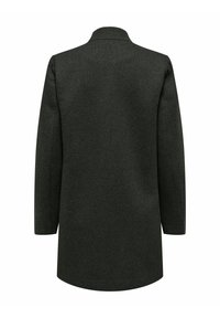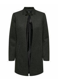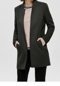 Femme portant un long manteau gris foncé texturé par-dessus un haut rose clair scintillant avec un col rayé, les mains dans les poches du manteau, et un pantalon noir.