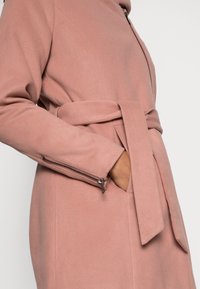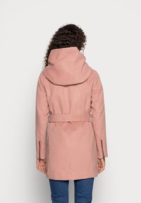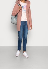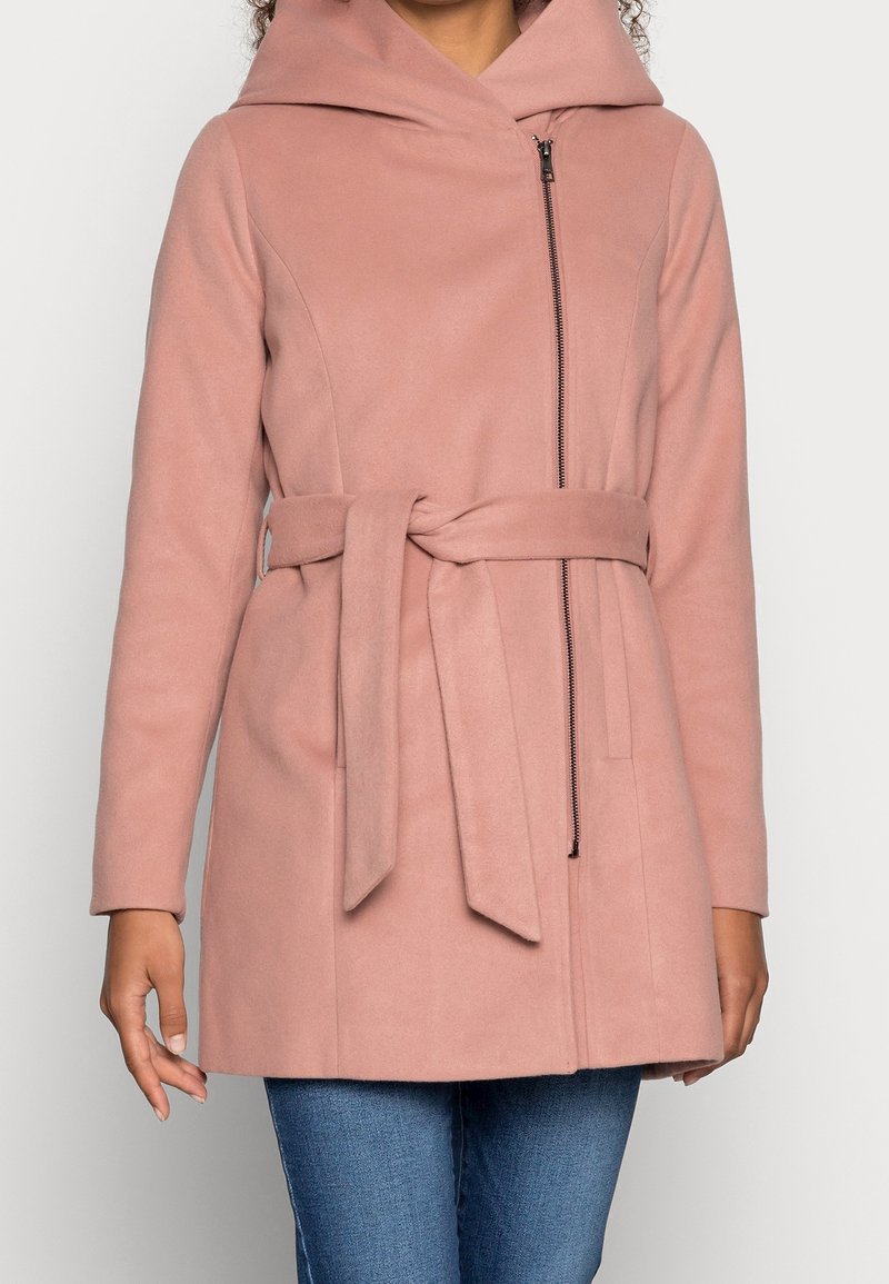 Femme portant un manteau rose poudré ceinturé avec une fermeture éclair asymétrique sur le devant et une capuche, associée à un jean bleu.