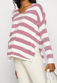 Femme portant un pull ample à rayures horizontales roses et blanches avec un col en V et un pantalon côtelé crème, debout devant un fond uni.