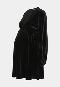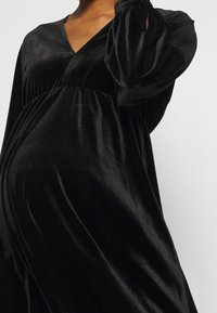 Personne enceinte portant une robe noire en velours à manches longues avec des collants noirs transparents à pois, debout avec une main sur la hanche.