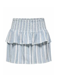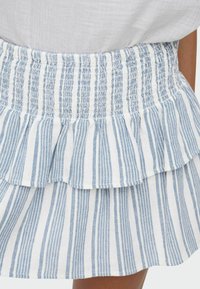 Femme portant une mini-jupe à volants rayée bleu et blanc, un haut blanc et des chaussures plates beiges tissées, debout les bras détendus le long du corps.