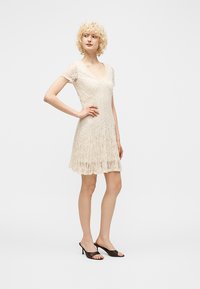 Femme aux cheveux blonds bouclés portant une robe courte en dentelle crème avec un col en V, debout devant un fond clair uni.