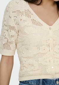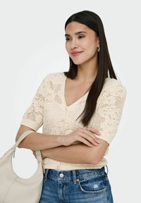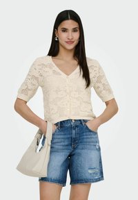 Femme portant un haut à manches courtes en tricot crème avec boutons, short en denim bleu, tenant un sac à main beige, debout devant un fond uni.