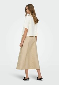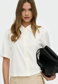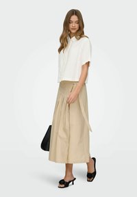 Jeune femme aux longs cheveux portant une chemise blanche à manches courtes boutonnée et une jupe plissée beige, tenant un sac à bandoulière noir.