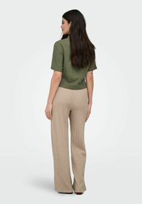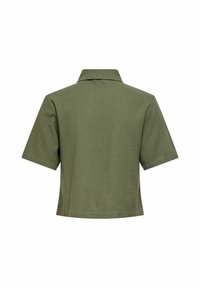 Femme aux longs cheveux noirs portant une chemise kaki à manches courtes boutonnée et un pantalon beige texturé, debout devant un fond clair.
