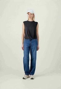 Top noir sans manches en matériau doux, avec un col rond et un détail de nœud à la taille, associé à un jean en denim bleu.