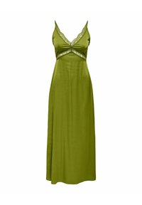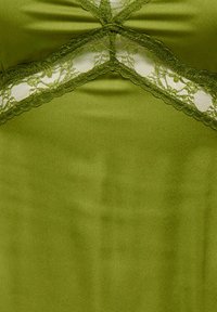 Nuisette en satin vert olive avec bordure en dentelle au décolleté en V et sous la poitrine, dotée de fines bretelles et d'une longue jupe fluide.