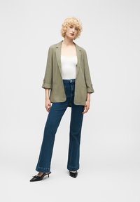 Personne blonde portant un blazer ouvert vert olive sur un haut blanc et un jean bleu, debout devant un fond uni gris clair.