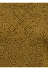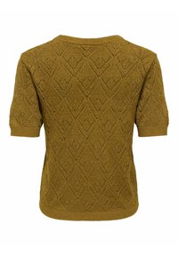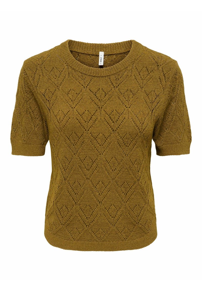 Pull tricoté vert olive à manches courtes avec motif en losanges ajourés et col rond et poignets côtelés.
