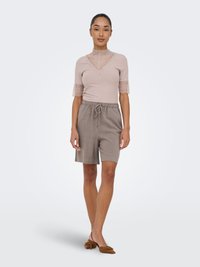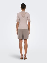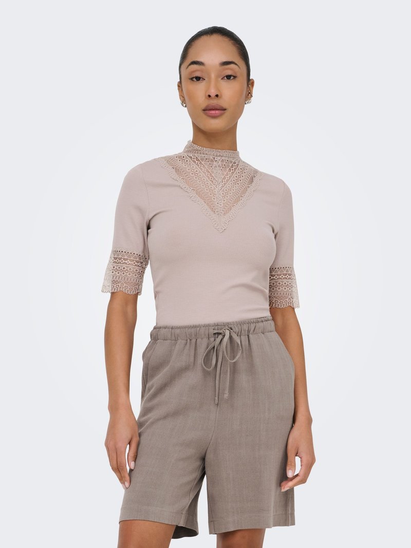Femme portant un haut à manches courtes beige avec détails en dentelle et un short taupe à cordon, debout devant un fond clair.
