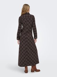Jeune femme portant une longue robe à boutons à carreaux marron foncé avec des poches avant et des bottines marron, posant devant un fond blanc.