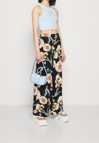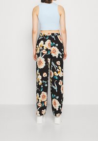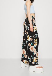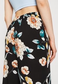 Pantalons larges noirs avec un motif floral en orange, jaune et bleu canard. Fabriqués en tissu léger avec une texture lisse.