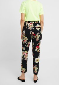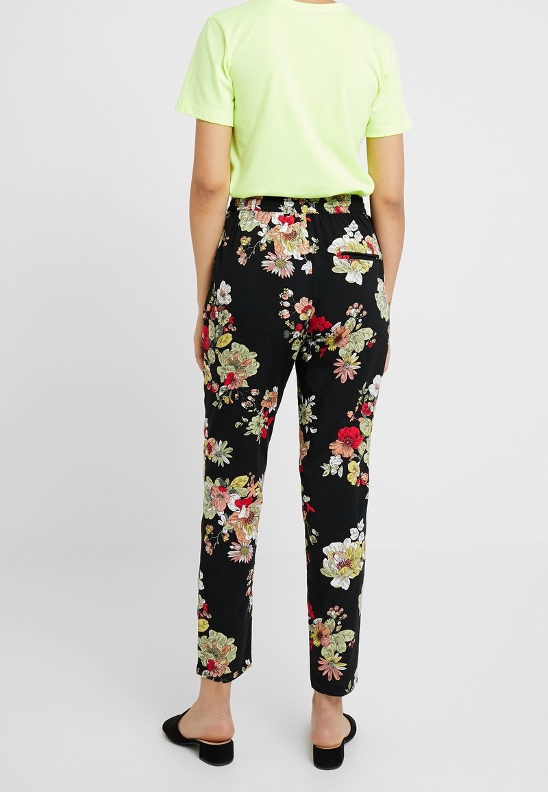 Pantalon noir à motifs floraux avec des fleurs colorées en rouge, jaune et vert, une taille élastique et un détail de poche arrière.