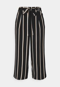 Pantalon à jambes larges rayé noir et blanc avec une ceinture nouée à l'avant, présentant des rayures verticales et un tissu doux et texturé.