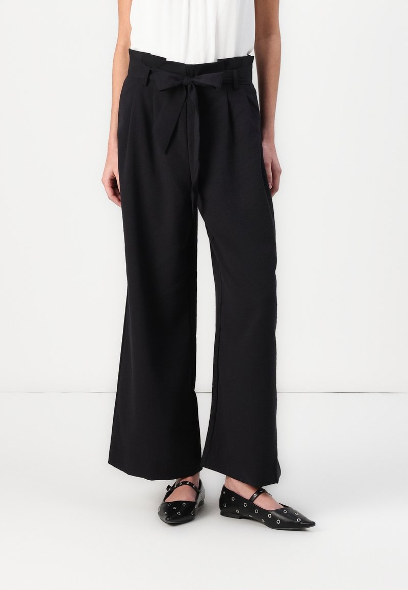 Pantalon large noir en tissu léger, avec ceinture à nouer, plis à la taille et texture lisse.