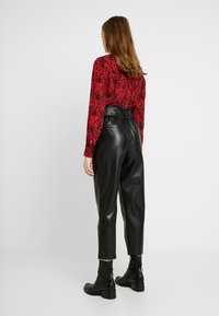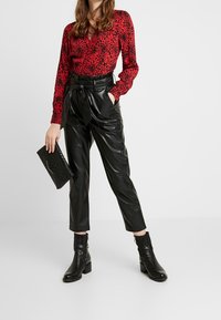 Femme portant un pantalon noir en similicuir taille haute avec une ceinture nouée, associé à des bottines noires et un haut à manches longues rouge à motif.