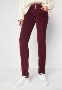 Pantalons en velours côtelé bordeaux ajustés à taille haute, avec trois boutons, assortis d'un pull crème et de baskets blanches.