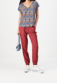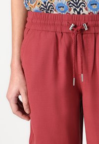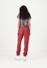 Pantalons de jogging légers rouges avec une taille élastique et des poignets élastiques, dotés de poches latérales et associés à des baskets montantes blanches.