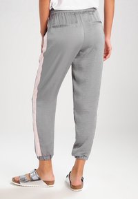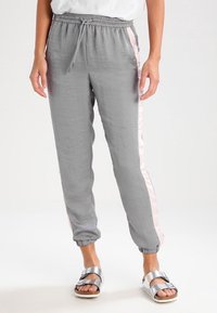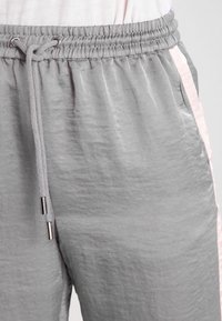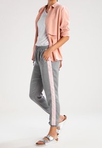 Pantalons de jogging léger gris avec des rayures roses sur les côtés, taille élastique et poignets fuselés. Assortis à des sandales en argent.