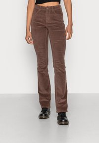 Pantalon en velours côtelé marron avec une coupe ajustée, des jambes droites et une surface texturée. Il est doté d'une fermeture par bouton et de deux poches avant.