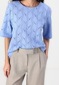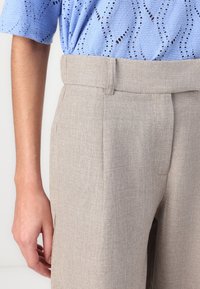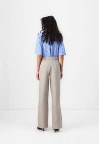Pantalon beige à jambes larges associé à des chaussures noires à bout pointu, porté avec un haut bleu clair à manches courtes en œillet.