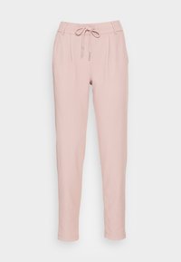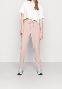 Pantalon fuselé rose clair avec une taille à cordon, en tissu texturé. Associé à des chaussures de sport colorées.