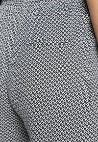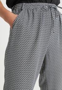 Pantalon à motif noir et blanc avec une ceinture élastique et un cordon de serrage. Design à jambes fuselées ; porté avec des bottines à talons noires.