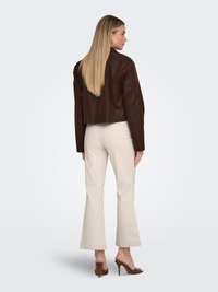 Femme portant un pantalon beige à jambes larges, des talons ouverts marron, un top blanc court et une veste en cuir marron, debout avec une main dans la poche.