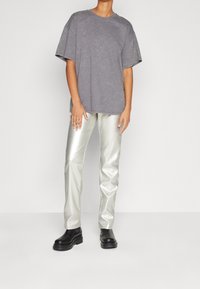 Pantalons métalliques argentés avec une texture lisse et brillante, présentant un design classique à cinq poches et une taille standard. Associés à des chaussures noires.