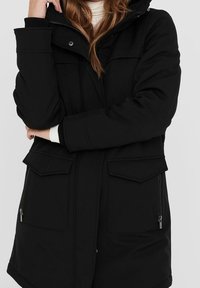 Parka noir isolé avec une capuche, comportant une fermeture éclair à l'avant, des boutons-pression, deux poches poitrine et un ourlet légèrement courbé. Texture lisse.